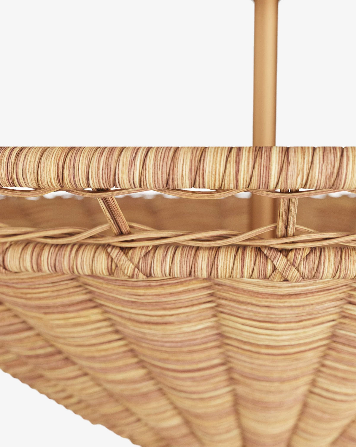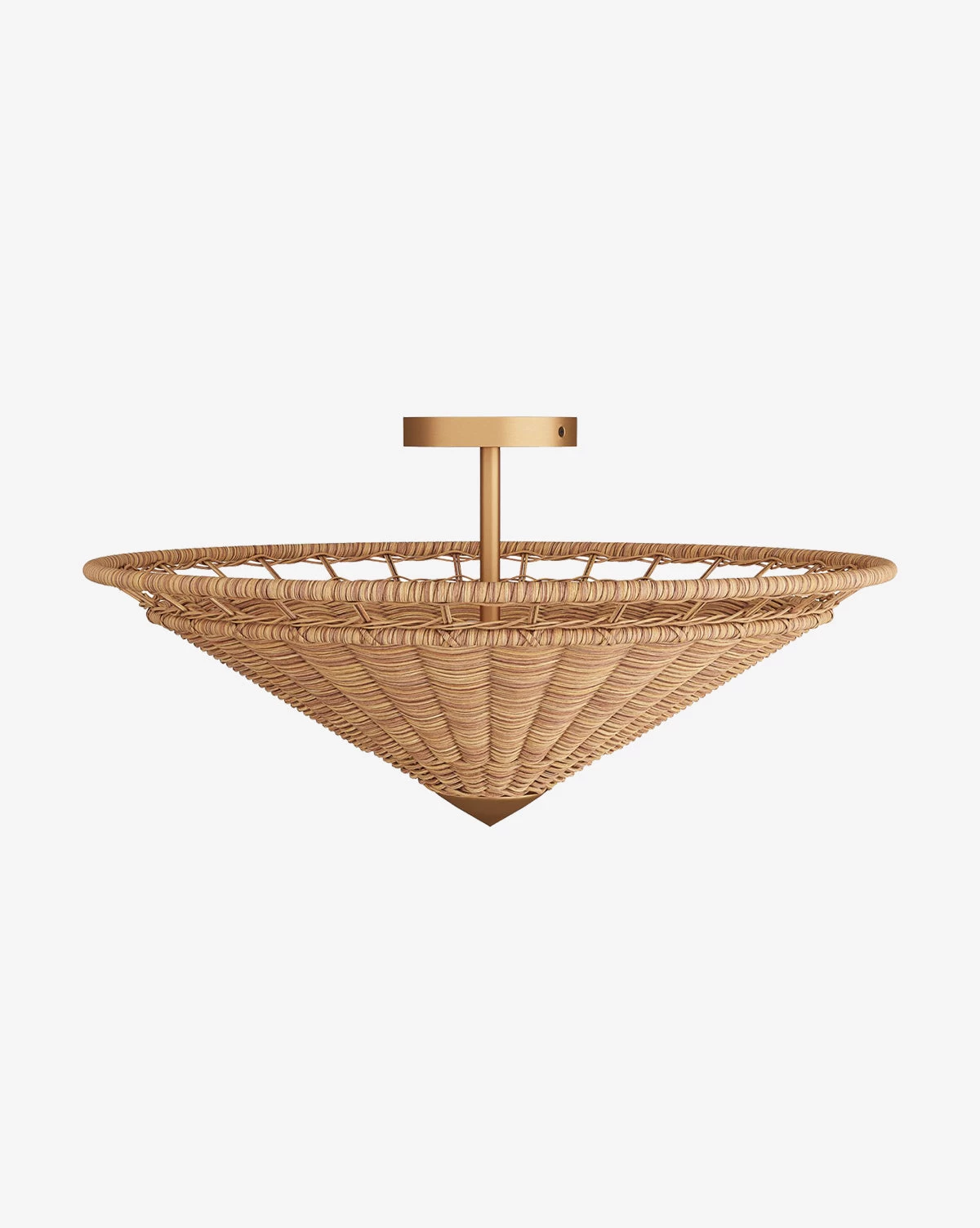 Featuring a streamlined yet organic tapered shape woven from natural rattan, the Terrance Flush Mount elegantly mixes materials. With a gold iron structure, this pendant blends modern design with textural details.