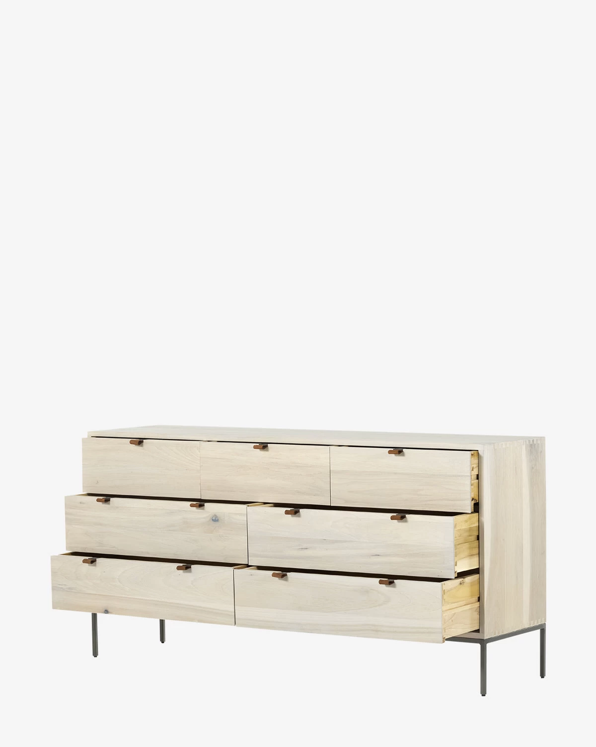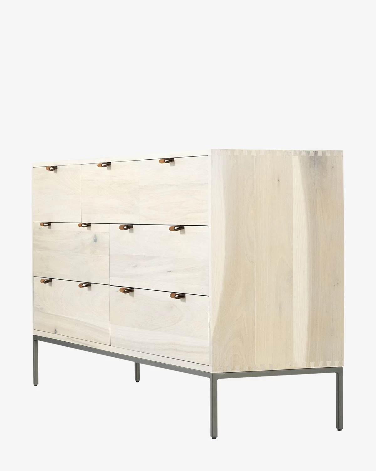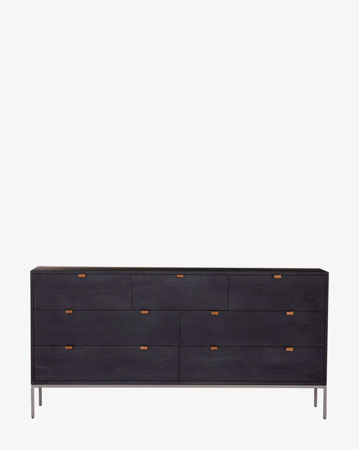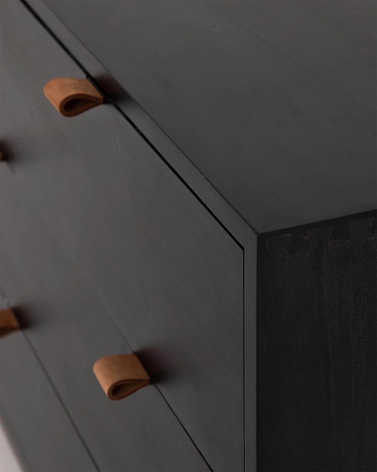Crafted from solid poplar with detailed dovetail joinery, the Thorton Dresser adds style to your bedroom without sacrificing storage. In a either a black or white-washed finish contrasted with metal-secured toffee leather pulls and slender iron legs, this dresser gives mid-century design a material-driven update.