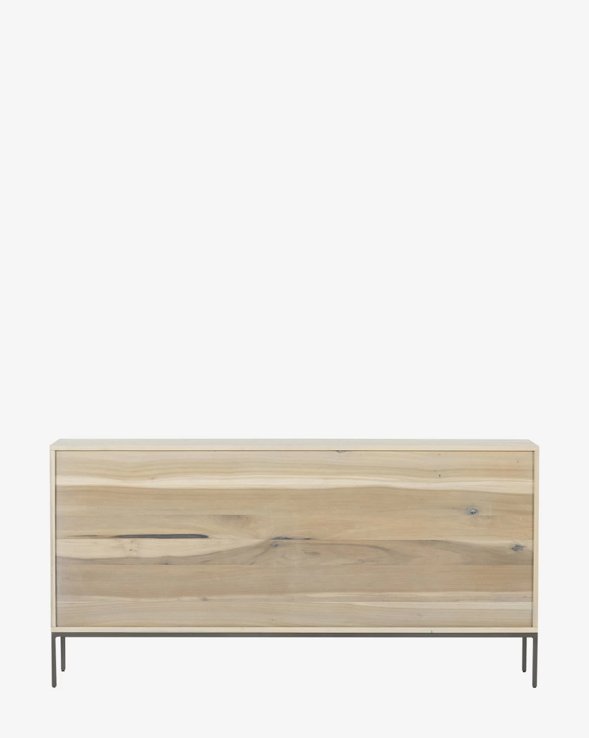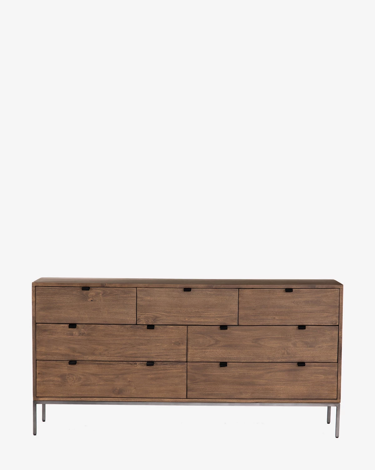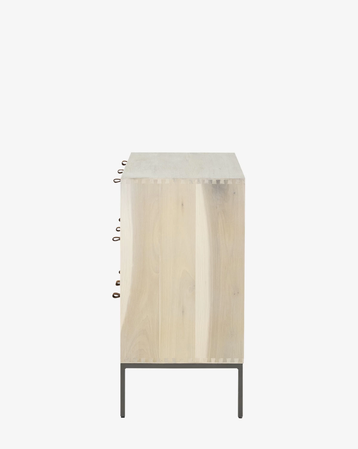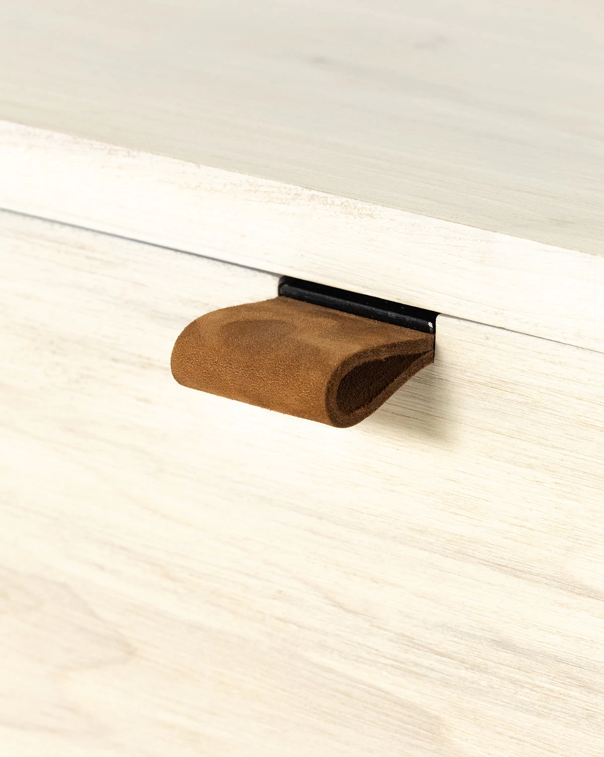 Crafted from solid poplar with detailed dovetail joinery, the Thorton Dresser adds style to your bedroom without sacrificing storage. In a either a black or white-washed finish contrasted with metal-secured toffee leather pulls and slender iron legs, this dresser gives mid-century design a material-driven update.