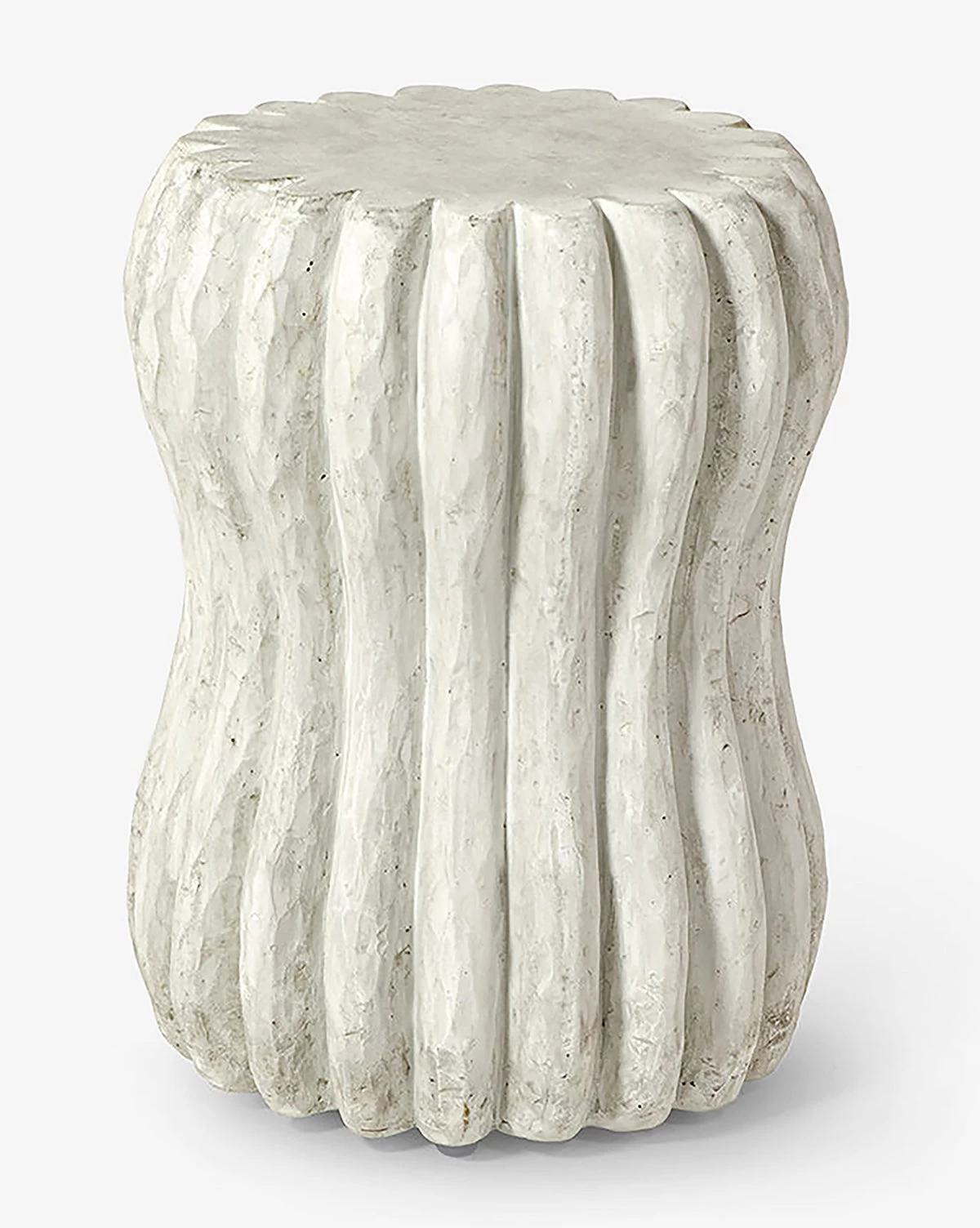 Dramatically ribbed in a classic curve silhouette shape, the Tycen Indoor / Outdoor Side Table is hand-chiseled with detail. Crafted from composite stone and given an aged white cement finish, its porous texture is coated to protect against small spills for a low-maintenance addition to outdoor styling. Due to the handmade nature of this product, no two will be exactly alike.