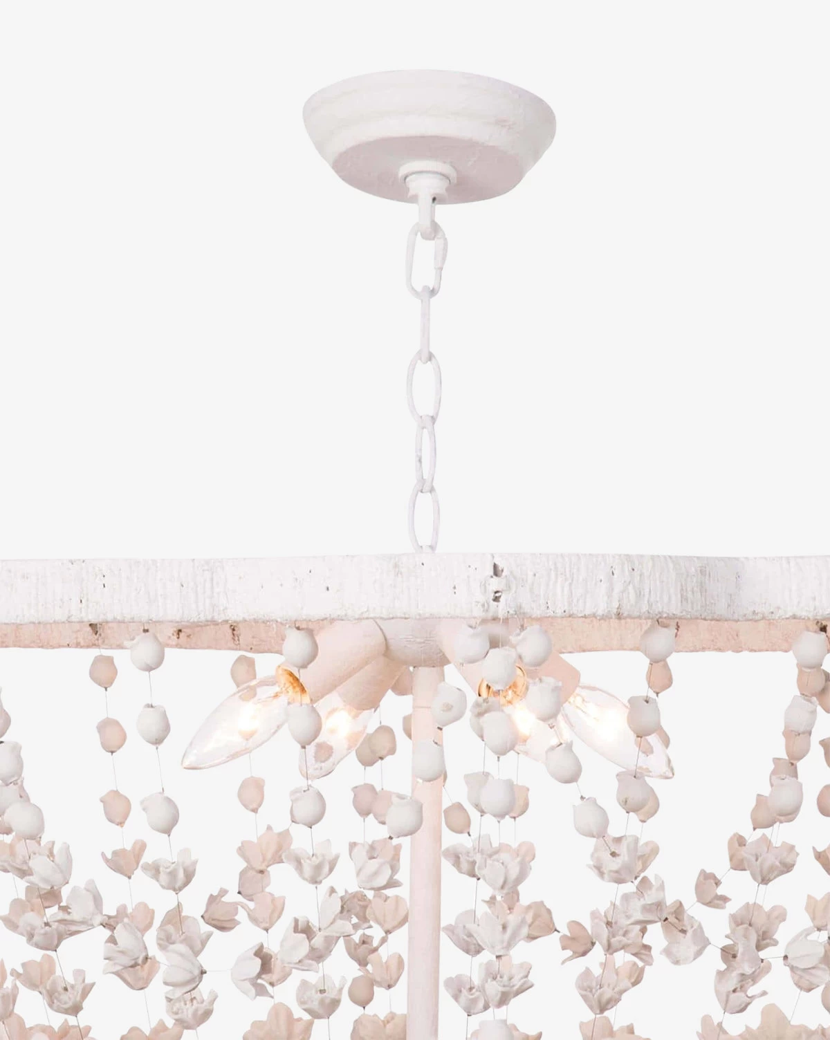 With delicate white florals strung together around its frame, the Vanessa Basin Chandelier creates a beautiful decorative moment in your space. Simple in palette, a white resin finish adds texture and an antique feel to the chandelier.