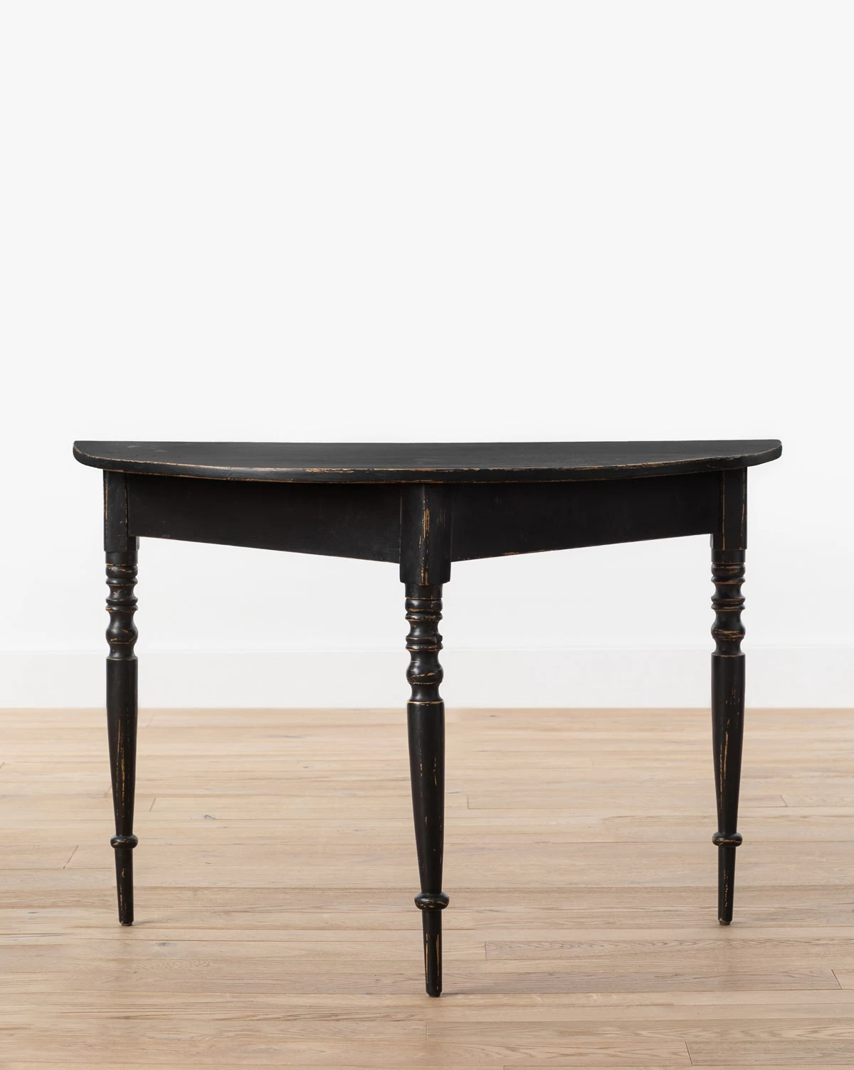 Originally from Sweden in the late 1800s, the Vintage Painted Black Swedish Demi Lune Tables were touched up with black paint at some point during the last century, adding layers of history to the classic demi lune tables. As part of our Vintage Collection, these vintage tables were hand-selected by our team for the unique character, heirloom quality, and beauty they will add to the home.