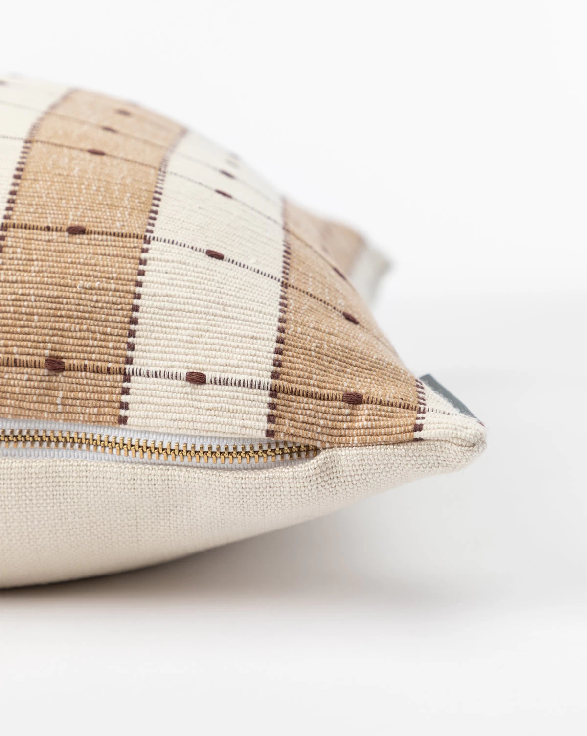 Textural and refined, Vintage Tan Check Pillow Cover No. 1 features an ivory and tan checkerboard stripe with dark brown lines and dots for an added layer of detail. As part of our Vintage Collection, this vintage pillow cover was hand-selected by our team for the unique character, heirloom quality, and beauty it will add to the home.Â