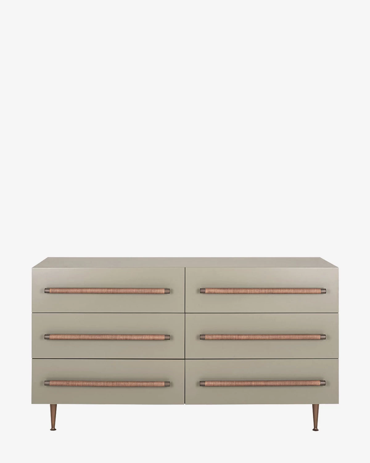 The Westlyn Dresser is modern but classic. Without sacrificing storage for style, simple brass accents and hand-wrapped rattan drawer pulls show great attention to detail while making a distinctive statement in your bedroom.