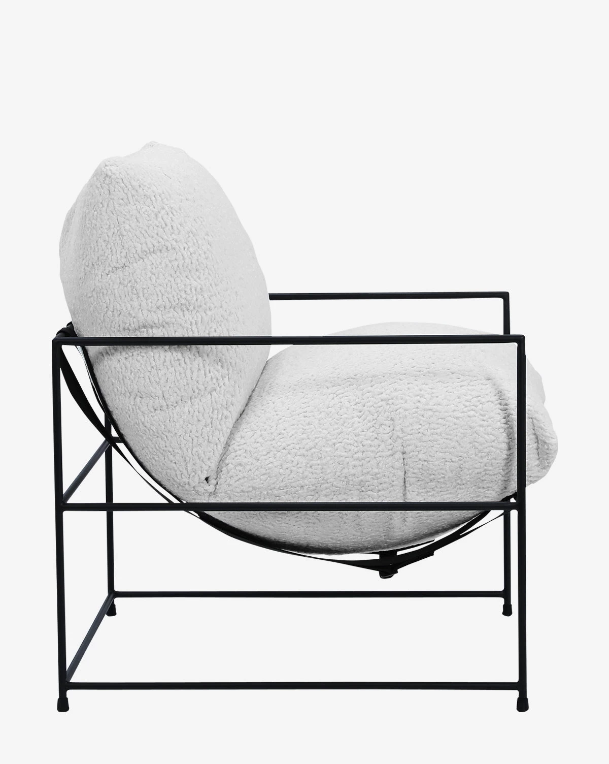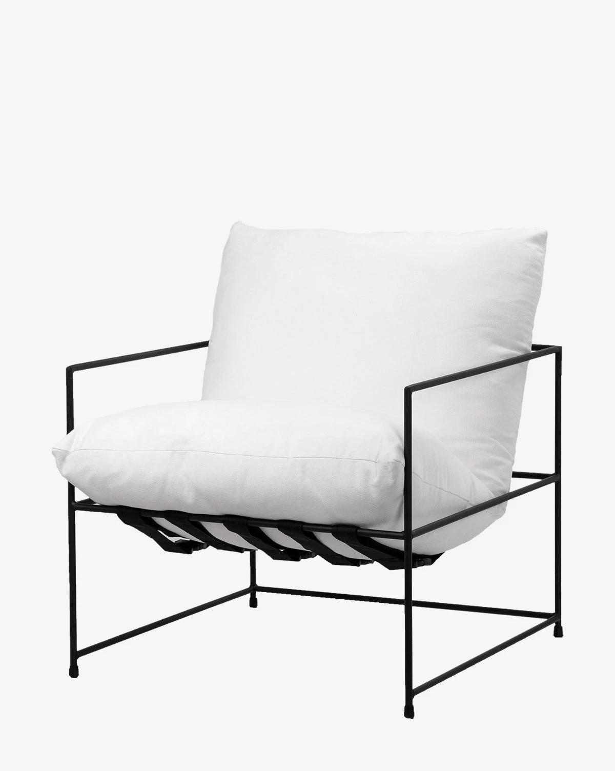 The Yates Chair is as aesthetic as it is comfortable. Its open, black metal frame cradles its cushions, giving an airy feel to this contemporary design. With off-white, performance fabric upholstered cushions that are deep and relaxed, the Yates Chair has a comfortable feel and modern style.
